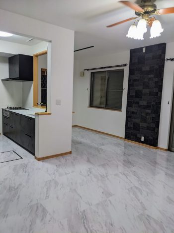 隣接する和室も畳を撤去。リビングと共にフロアタイルで仕上げました。白を基調とした奥様こだわりのキッチンで家事をしながら大好きなジャイアンツをテレビ観戦できると大満足していただきました❢