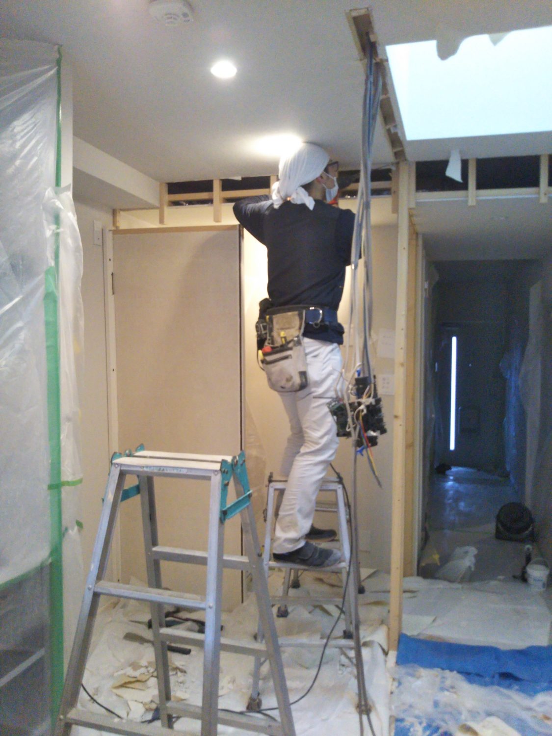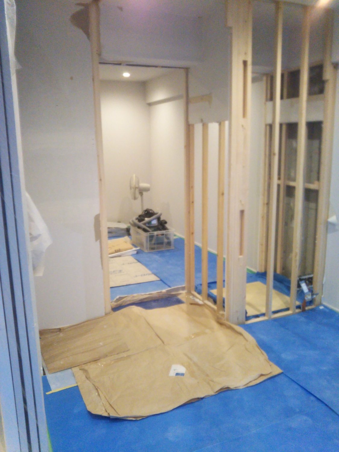 壁にベニヤを張り、床も10cm上げる為下地を組みコンパネを張ります。ダウンライトとコンセントのための電気配線もします。
